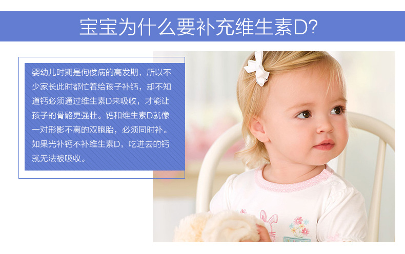 【产品功效】 帮助钙的吸收、支持健康的免疫系统、帮助宝宝骨骼发育等