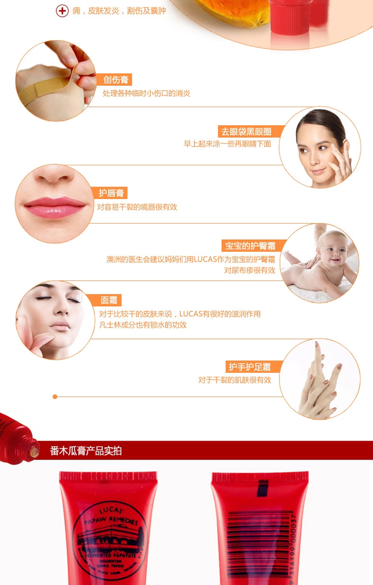 【产品功效】 护手护足霜、滋润嘴唇、伤口消炎、去除黑眼袋、宝宝的护臀霜等