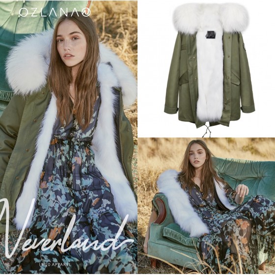 OZLANA AU 时尚皮草大衣 军绿色外壳 经典白色狐狸毛 AU192024