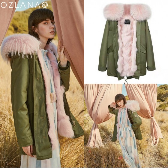 OZLANA AU 时尚皮草大衣 军绿色外壳 经典粉色狐狸毛 AU192027