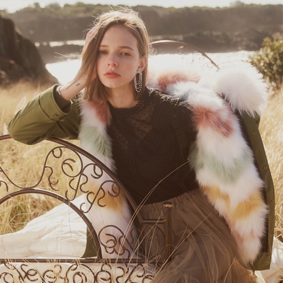 OZLANA AU 时尚皮草大衣 军绿色外壳 彩虹V形线条狐狸毛 AU192035