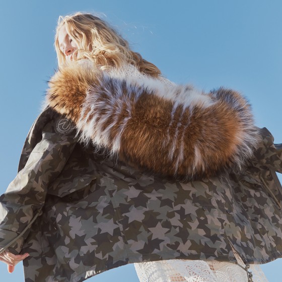 OZLANA AU 时尚皮草大衣 军绿星星迷彩外壳经典原色郊狼毛 AU192066